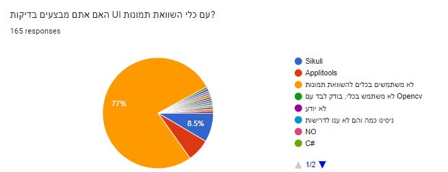 - רוב החברות – 77% אינן מבצעות בדיקות UI אוטומטיות עם כלי השוואת תמונה, השאר (8% בהתאמה ל-2 התשובות) מבצעות בעזרת Applitools ו- Sikulli.